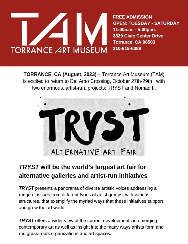 TRYST is a new international art fair for artist-run-spaces and collectives as well as an international conference addressing the needs and future of global exchange for artist-run spaces, collectives and organizations, run through the Torrance Art Museum and the City of Torrance.